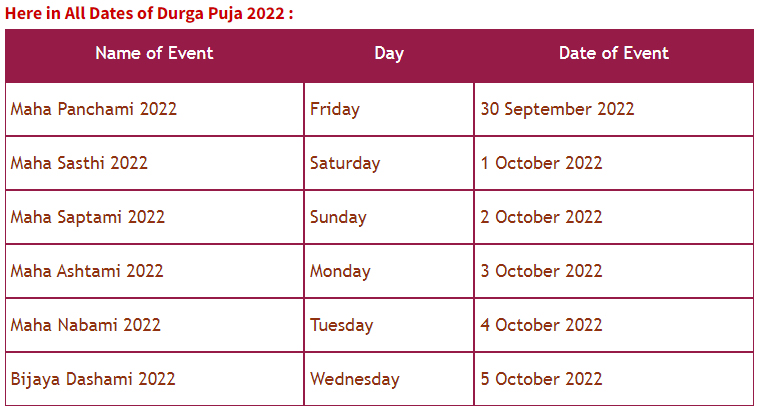 The rituals of Durga Puja last ten days with the start and the last five days being special festivals that are refelected in public holidays in some states in India.